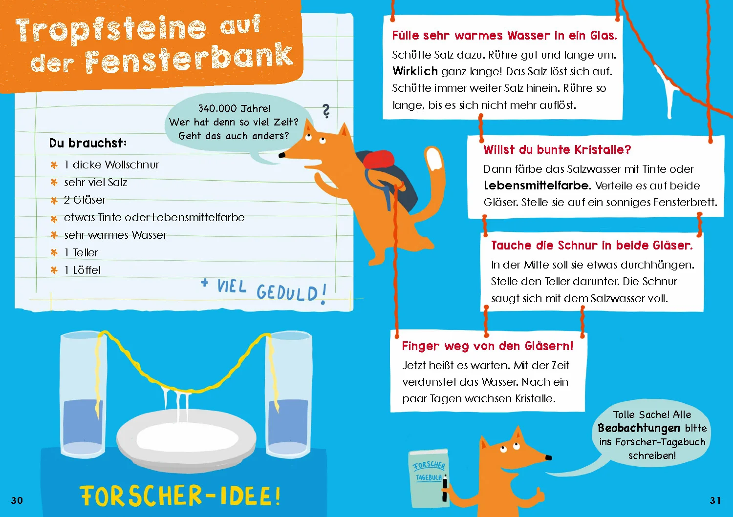 Und weil das Expertenteam vom Haus der Kleinen Forscher von Filus Reise ebenfalls ganz begeistert war, haben sie noch eine Forscher-Idee zum Nachmachen beigesteuert: Bau dir deine eigene Tropfsteinhöhle – auf der Fensterbank. Echt wahr!
